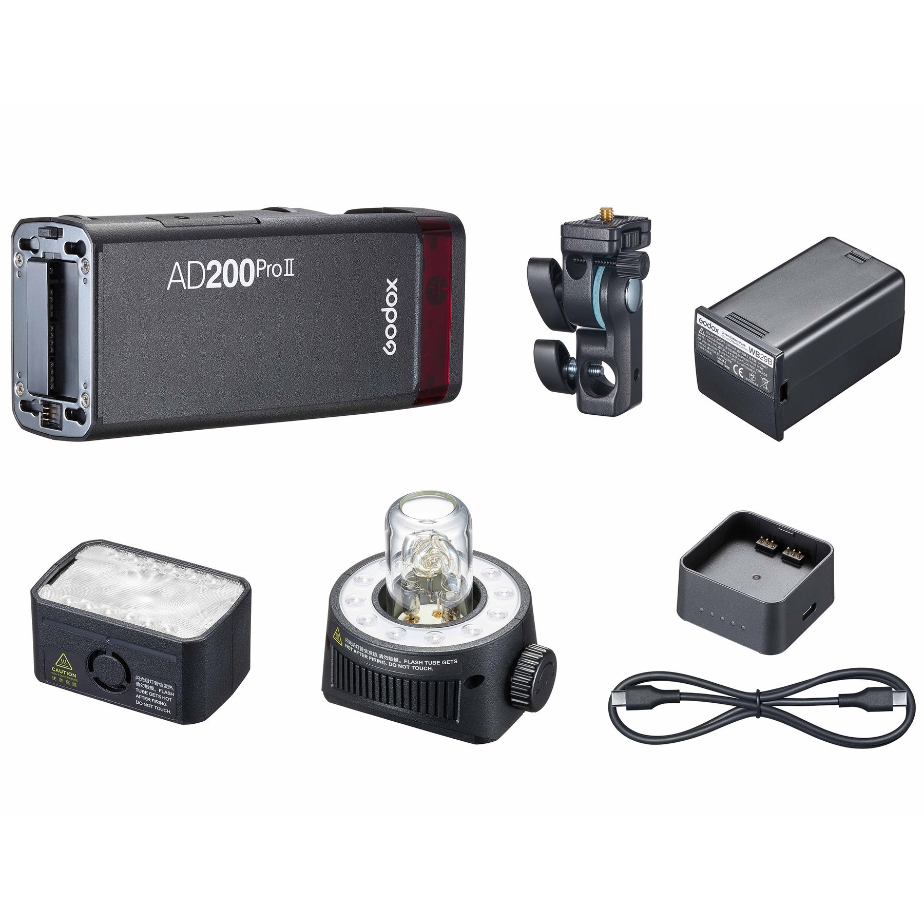 Accessoires inclus : Boîtier de flash - Tête de flash Speedlite H200 II - Tête de flash à ampoule nue H200J II - Tube flash - Batterie (WB29) - Chargeur - Adaptateur PD - Câble USB - Support AD-E2 - Couvercle de protection de la batterie - Sac de transport