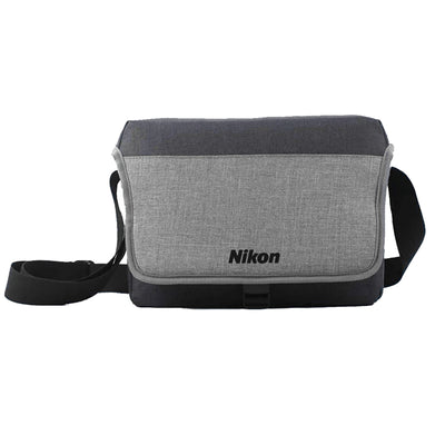 The DSLR Canvas Style Bag is a small camera bag designed to hold a DSLR and accessories, featuring removable dividers that allow you to configure the bag to your needs. The bag is grey and black in color. Additional pockets, a latch closure on the front and shoulder strap with the Nikon logo printed on it round out the features of the bag.